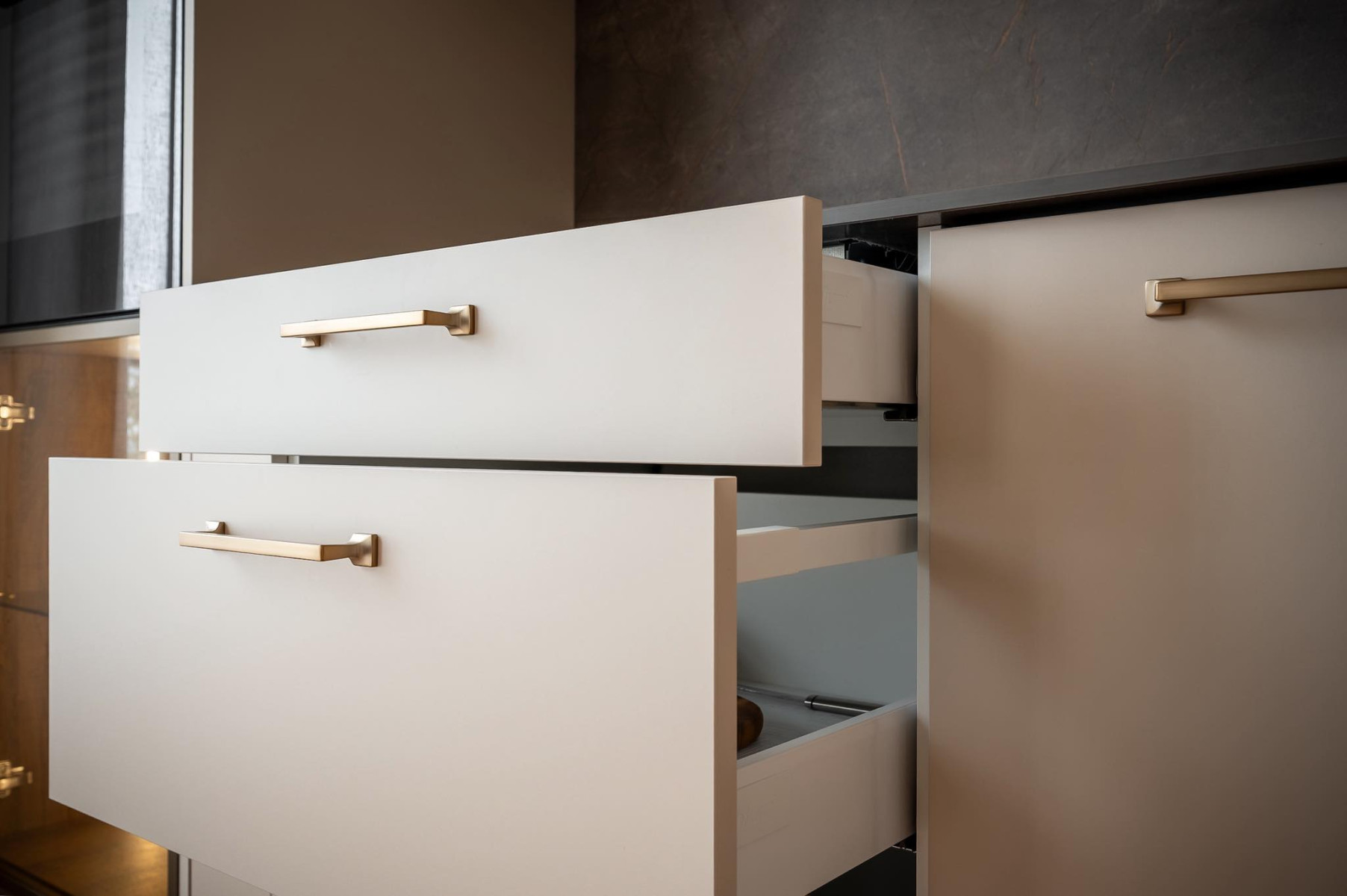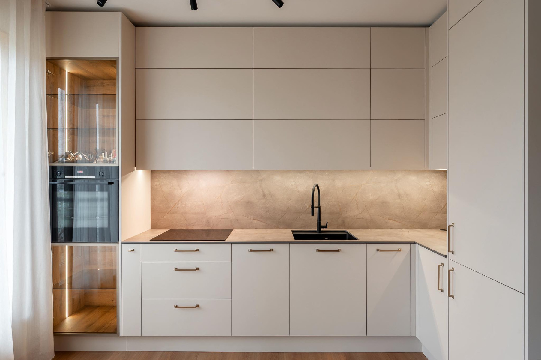 Stikls kļūst par vienu no galvenajiem materiāliem 2026. gadā. Ne tikai caurspīdīgs, bet arī rievots, matēts, krāsains vai pat nedaudz viļņots. Šādi stikla skapīši ļauj redzēt traukus vai dekorus, neatklājot tos pilnībā, tādējādi saglabājot virtuvi sakārtotu. Stikla durvis bieži izmanto kā starpsienu starp virtuvi un viesistabu - tās ļauj gaismai brīvi plūst, vienlaikus nodalot zonas. Šis risinājums īpaši labi strādā arī mazākās telpās, padarot virtuvi vizuāli plašāku un gaišāku.