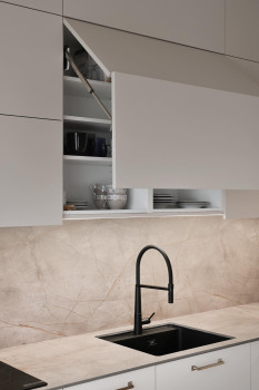 Stikls kļūst par vienu no galvenajiem materiāliem 2026. gadā. Ne tikai caurspīdīgs, bet arī rievots, matēts, krāsains vai pat nedaudz viļņots. Šādi stikla skapīši ļauj redzēt traukus vai dekorus, neatklājot tos pilnībā, tādējādi saglabājot virtuvi sakārtotu. Stikla durvis bieži izmanto kā starpsienu starp virtuvi un viesistabu - tās ļauj gaismai brīvi plūst, vienlaikus nodalot zonas. Šis risinājums īpaši labi strādā arī mazākās telpās, padarot virtuvi vizuāli plašāku un gaišāku.