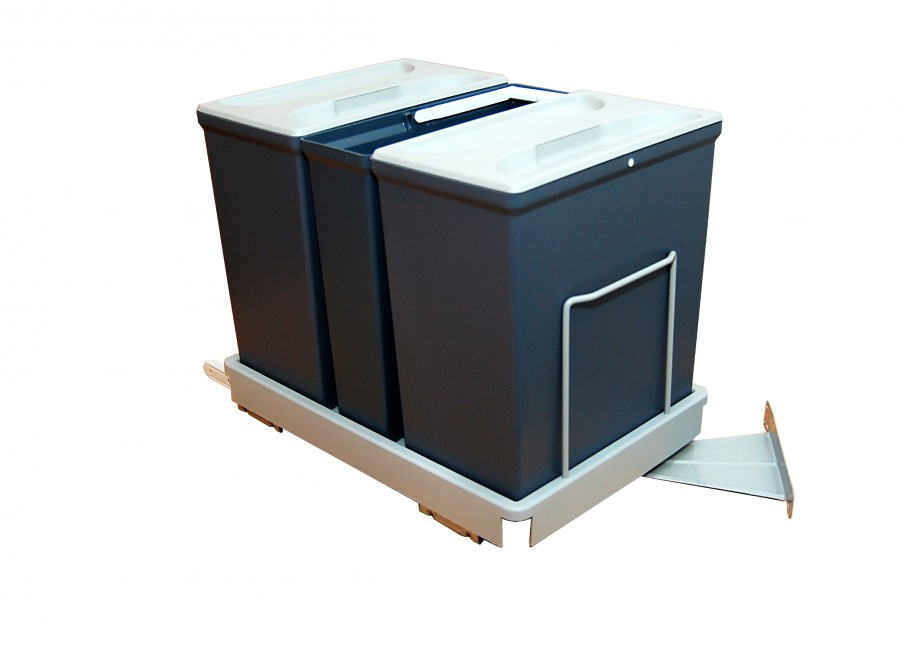 Atkritumu spaiņu komplekts paredzēts ievietošanai skapītī. Piemērots atkritumu šķirošanai. Komplektā ietilpst rāmis, spaiņi 13+6+13 l, nosedzošais vāks. Pelēks. Izvelkas, verot skapja durvis.