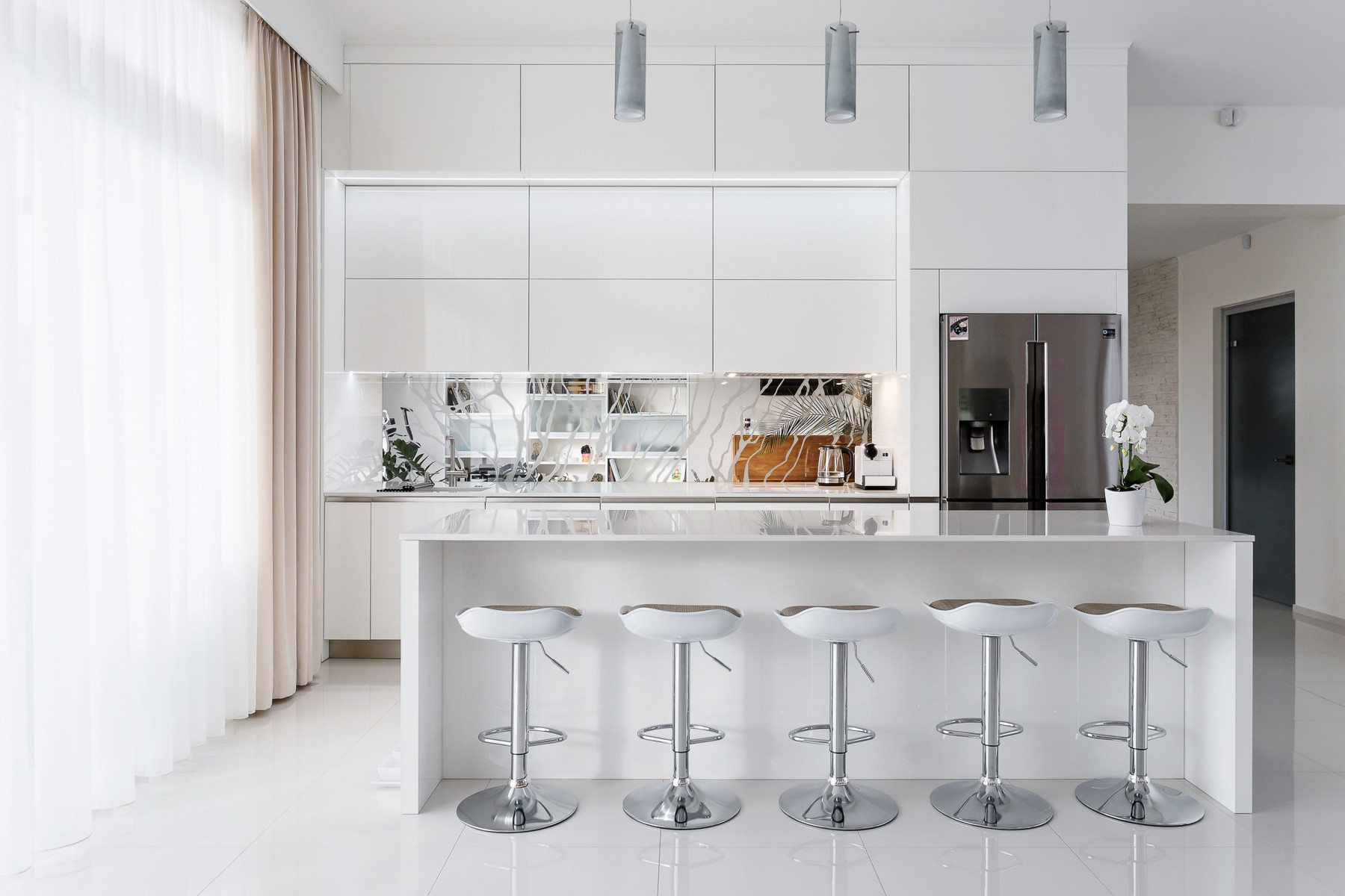 Šajā virtuvē kā valdošais tonis ir izvēlēts vienmēr aktuālais baltais un virtuves koptēls ir ieturēts modernā minimālisma noskaņās. Ir izvēlēta augstas kvalitātes keramiskā galda virsma, kurai piemīt neskaitāmi plusi, kā, piemēram, noturība pret skrāpējumiem, karstumu un ūdeni. Grīdas skapīšiem izvēlēti integrētie Furnipart Wall rokturi, un virtuvē ir pabūvētā izlietne no kompānijas Franke. Īpaši piedomāts ir arī par apgaismojumu, tāpēc virtuves mēbeles ir aprīkotas ar LED lentes risinājumiem vairākos līmeņos.